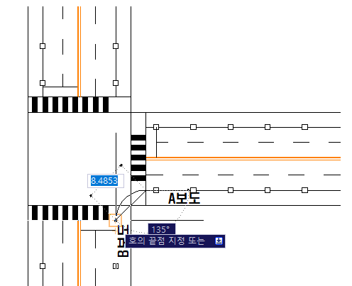 5. 끝점(각도) 지정 : 호의 끝점을 B보도 연결 지점으로 지정하면 됩니다. 이때 각도는 따로 입력 안하셔도 되고 끝점만 입력하시면 되는데, 처음 시작점(A보도)과 끝점(B보도)의 각도로 "R=입력값" 인 곡선이 완성됩니다.