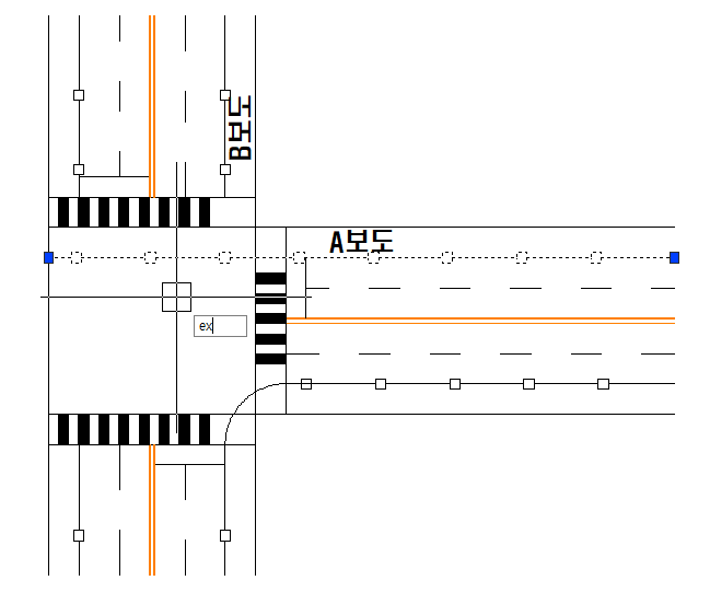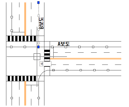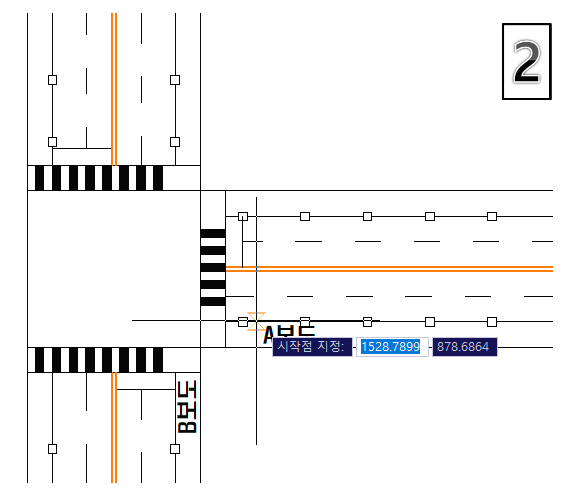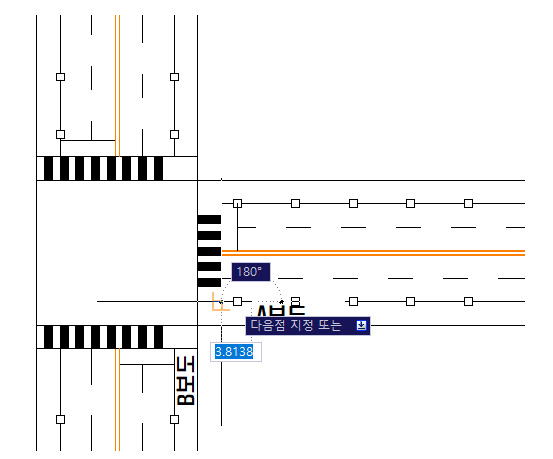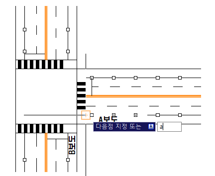 2. 시작 지점 클릭 : 폴리선의 시작은 직선이고 선의 방향(각도)은 기존 선(예시에서 A ro B보도 선)으로 시작하시면 됩니다.